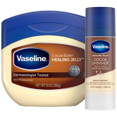 PERFECT PACK: Vaseline Rich Moisturizing Healing Jelly Cocoa Butter and Vaseline Cocoa Shimmer Jelly Stick are an ideal product pairing formulated to lock in moisture to help dull, dry skin heal with a light cocoa fragrance.